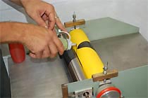 Place the previously embossed metal plate (see embossing equipment) between the base and the roller and feed the edge through. |
